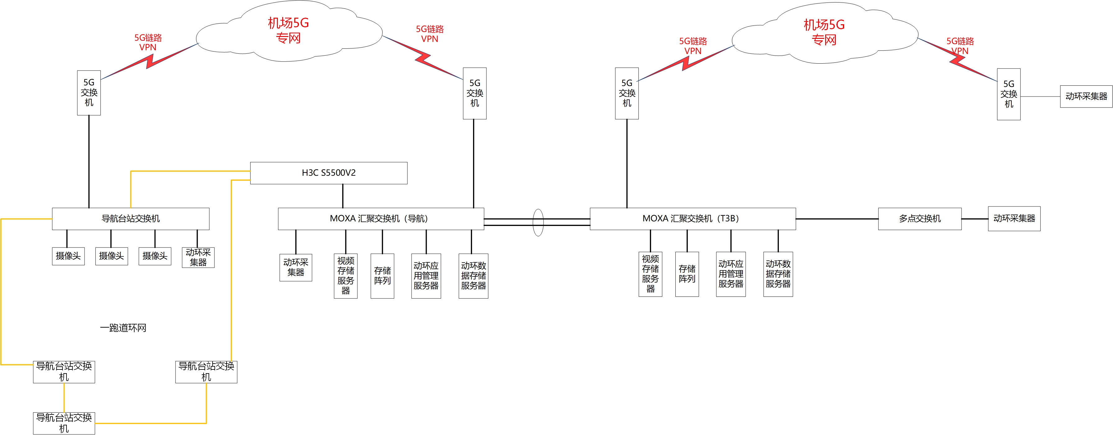 需将空调数据、UPS数据、温湿度数据、视频数据等传输到中心机房;现场共63个点位,数据汇聚到2个中心机房;有线传输采用光纤连接,5g传输使用机场5g专网;2个中心机房互为主备,确保系统的完整性及可用性;目前被监控设备大部分属于在网设备,需不停航施工